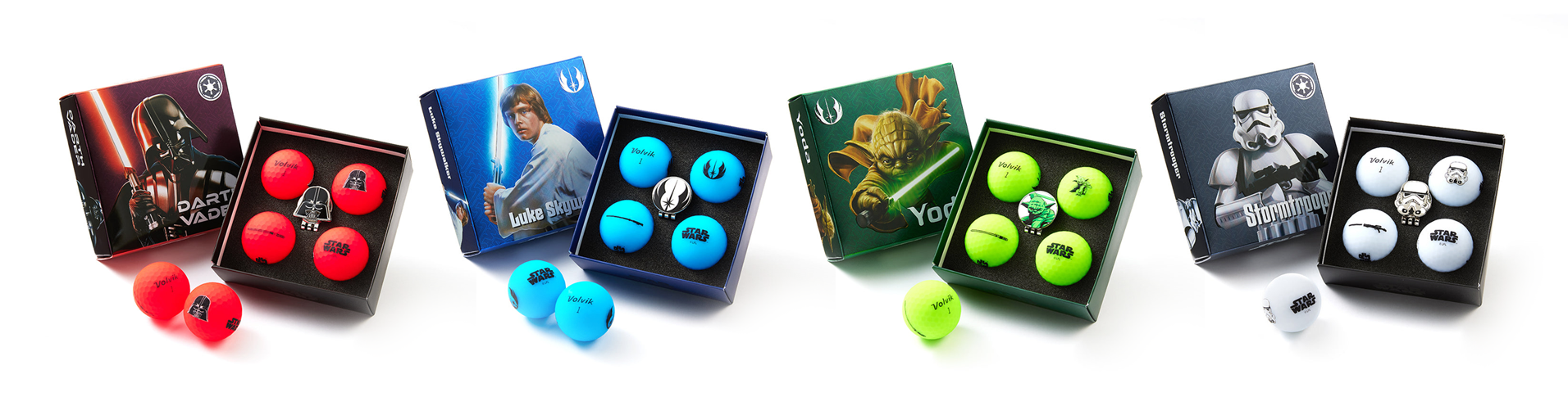 These matte finish Volvik sets come in bold character driven colors: green for Yoda, red for Vader, white for Stormtroopers and blue for Luke. The vivid cover is not just for looks, it makes tracking your ball in different lighting conditions much easier, and each set includes a unique themed ball marker to round it out.